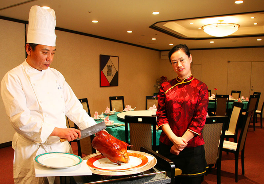 盤古創業時から絶大な人気を誇る北京ダック。一羽ご注文の際にはお客様の目の前でさばきます。